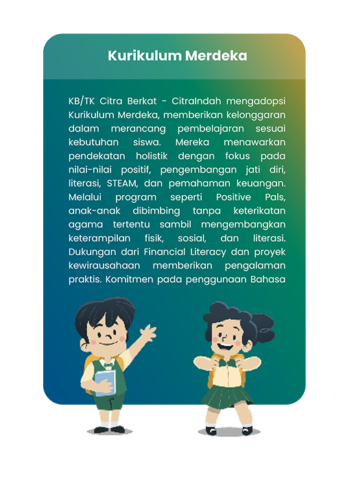 Saya tertarik pada program Enterprenureship di sekolah Citra. Menurut saya ini salah satu kelebihan dibandingkan sekolah lainnya. Seperti anak2 di ajarkan utk menghasilkan suatu produk menggunakan analisa canvas atau design thinking dan memasarkannya. Mempelajari kegiatan ekonomi di dunia nyata, dll. Saya harap program Enterpreneurship ini selalu dikembangkan.
